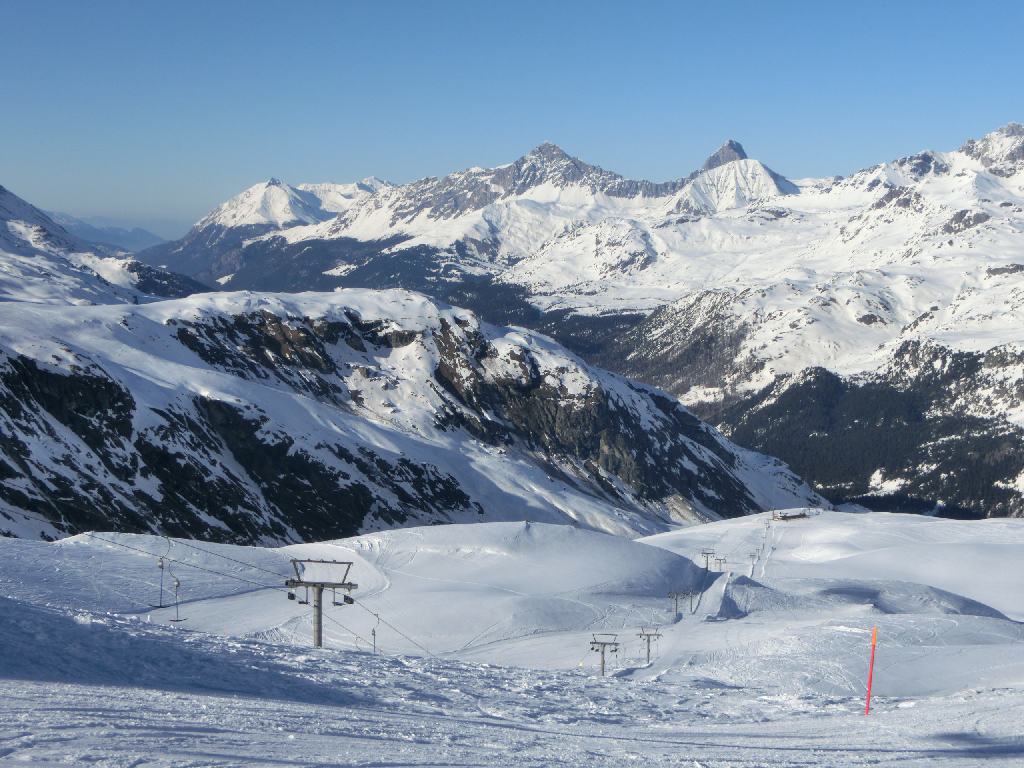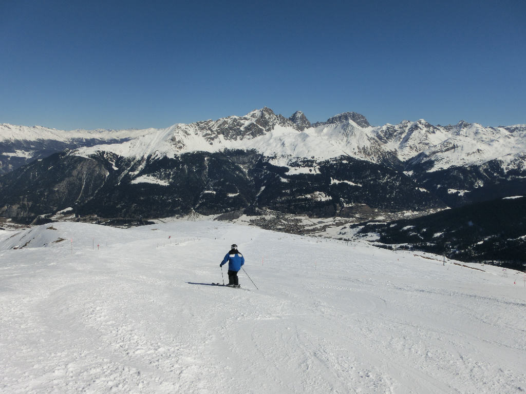 Für den Morgen des dritten Tages hatten wir uns ne Stunde mit einem Skilehrer gebucht. Eigentlich sollte der uns ein bischen mehr Sicherheit in schwierigem Gelände beibringen, aber die Pistenverhältnisse waren so optimal, dass es einfach kein schwieriges Glände gab. Er hatte aber trotzdem was an meiner Haltung auszusetzten, was mich auch nochmal einen guten Schritt weitergebracht hat. Die Sichverhältnisse waren ab diesem Tag sehr gut und wir bekamen zum ersten Mal einen Überblick über das Gebiet.